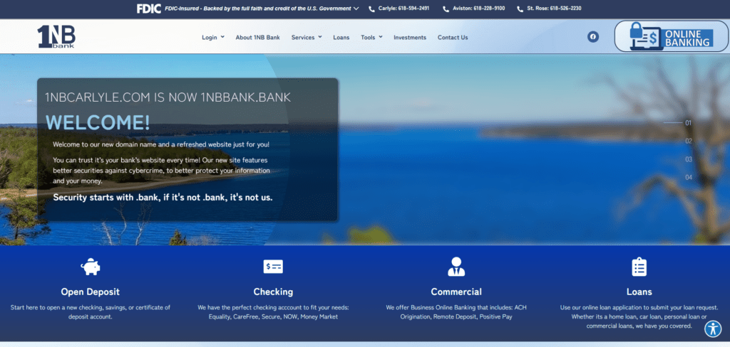 1NB Bank needed to transition from fnbcarlyle.com to 1NBBank.Bank with a fresh, updated, and more modernized look. They also needed ongoing maintenance, updates, and security hardening. We are honored to provide these services and look forward to working with 1NB Bank for a long time! URL: https://www.1NBBank.Bank